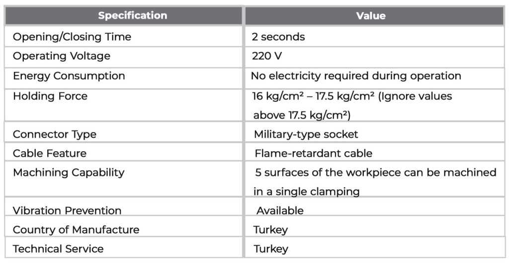 Electromagnetic tables are typically produced in standard and custom sizes. Standard sizes are usually determined according to industrial standards and are suitable for commonly used machine models. Custom sizes, on the other hand, are determined according to customer requests and are produced specifically for a particular project or application. Custom sizes can vary in dimensions and shapes from standard sizes and are usually designed to provide the required features for a specific product or application. For example, electromagnetic tables with a larger surface area can be produced in custom sizes to process larger parts.